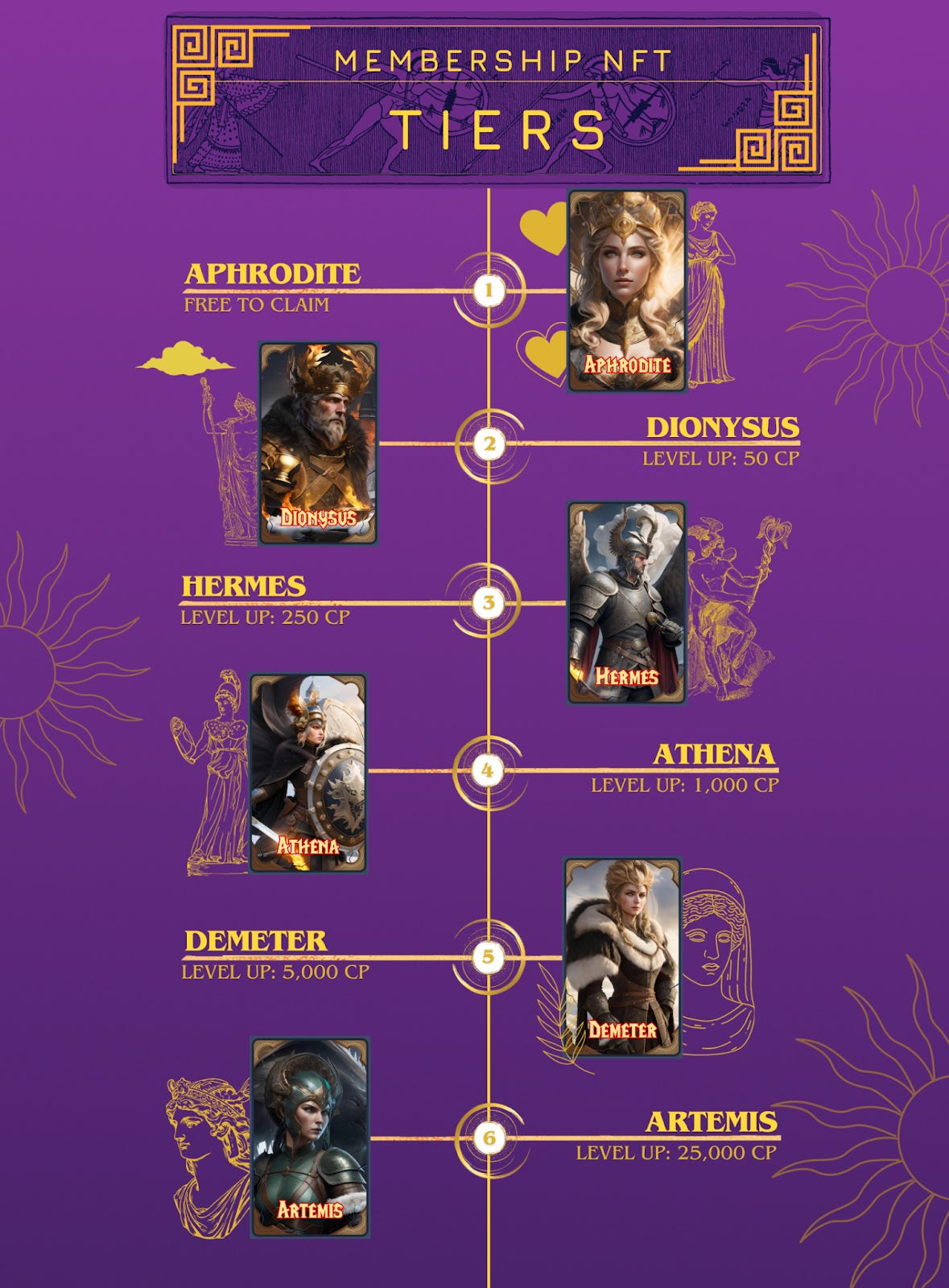 There are 12 tiers of membership, ranging from “Aphrodite” to “Zeus”. Users can upgrade their Membership NFTs to higher tiers by burning CPs (Contribution Points)